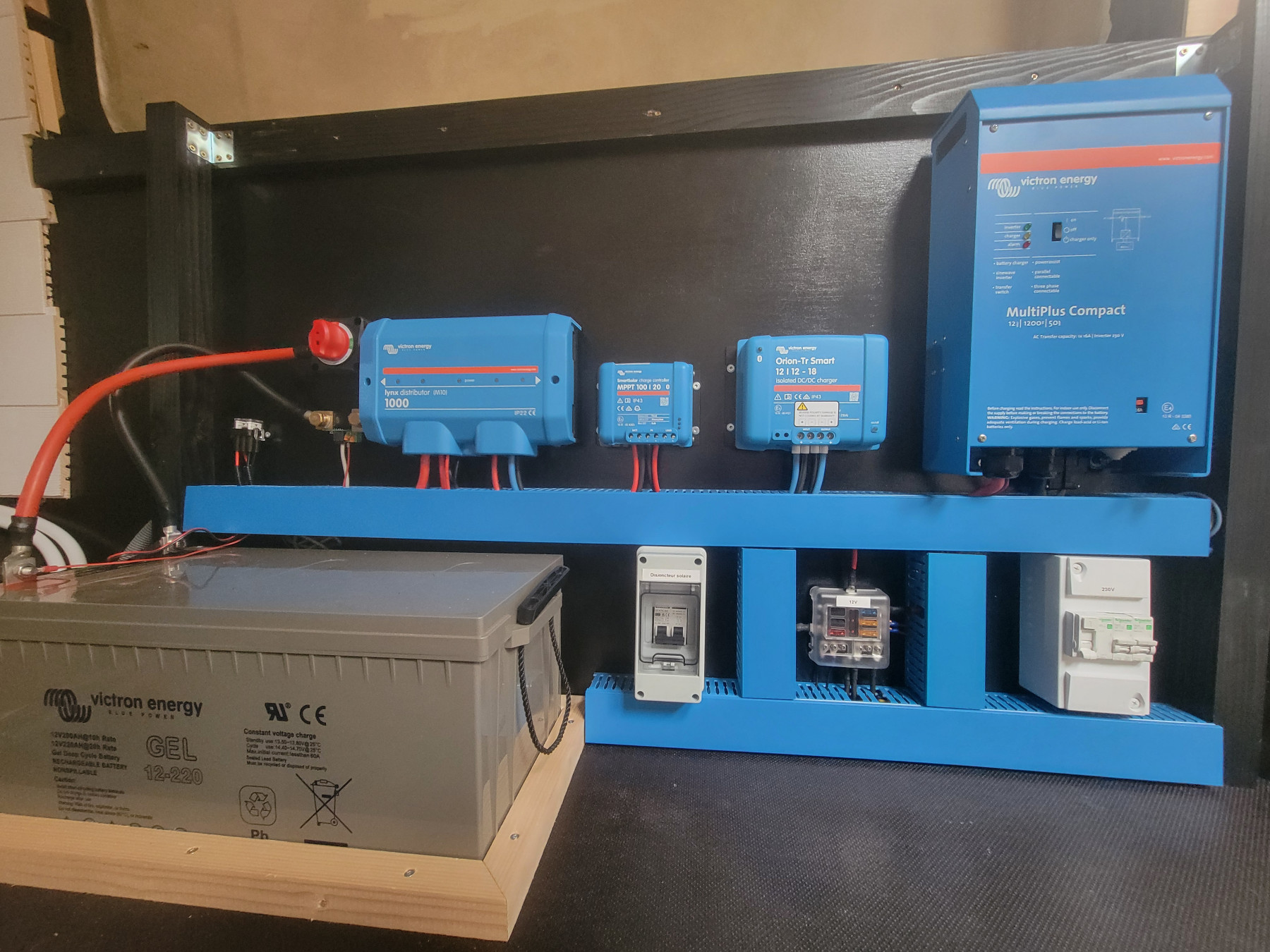 Une installation complète pour une puissance de sortie en 230v de 5000 VA (~4000w) et un stockage batterie de 300ah en 24v soit 7,2Kwh. Comprenant : Batteries Lithium NG 2 x 12,8v en série Fusible classe T et switch BEP Lynx smart Bms NG Lynx distributor Cerbo Gx et Ecran Gx touch Multiplus 24v/5000Va 2 x Mppt 100/50 et leurs disjoncteurs Orion 24/12 Orion Smart 12/24 Batterie protect Tableau DC Tableau AC équipé shneider Fusibles et goulottes de protection