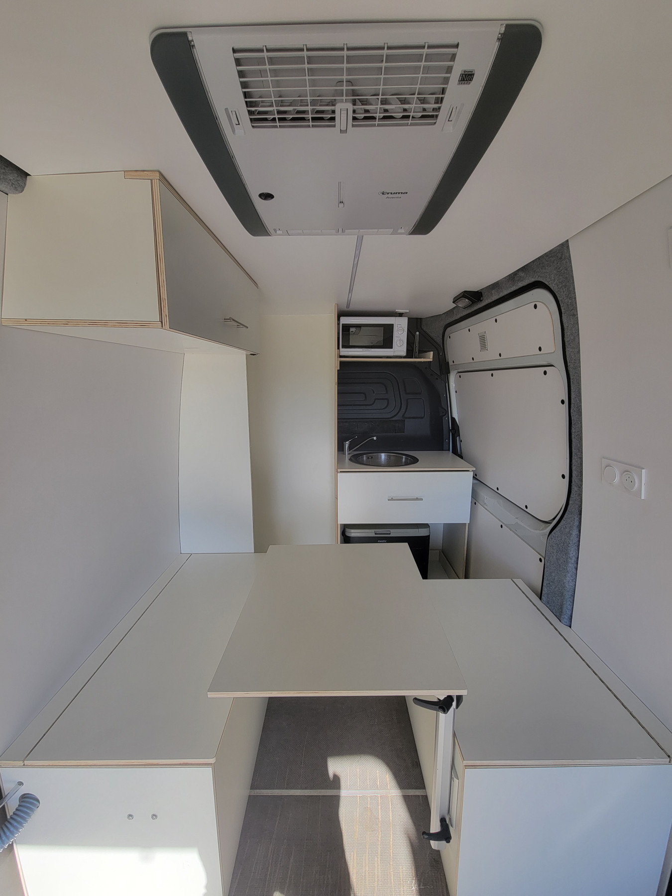 Un espace arrière dédié au transport des motos avec futur lit escamotable pour optimiser chaque mètre carré.