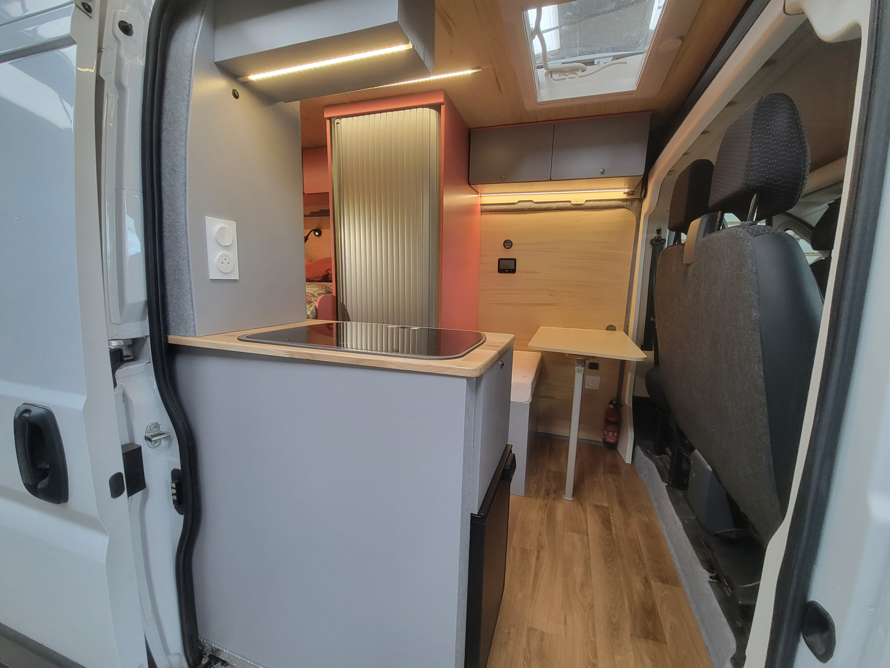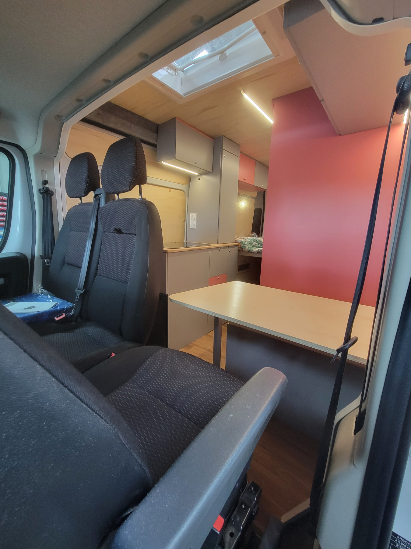 Nous sommes heureux de vous présenter notre toute dernière réalisation : un aménagement complet sur base de Peugeot Boxer L2H2, pensé pour 2 personnes, conçu pour voyager toute l’année, été comme hiver
